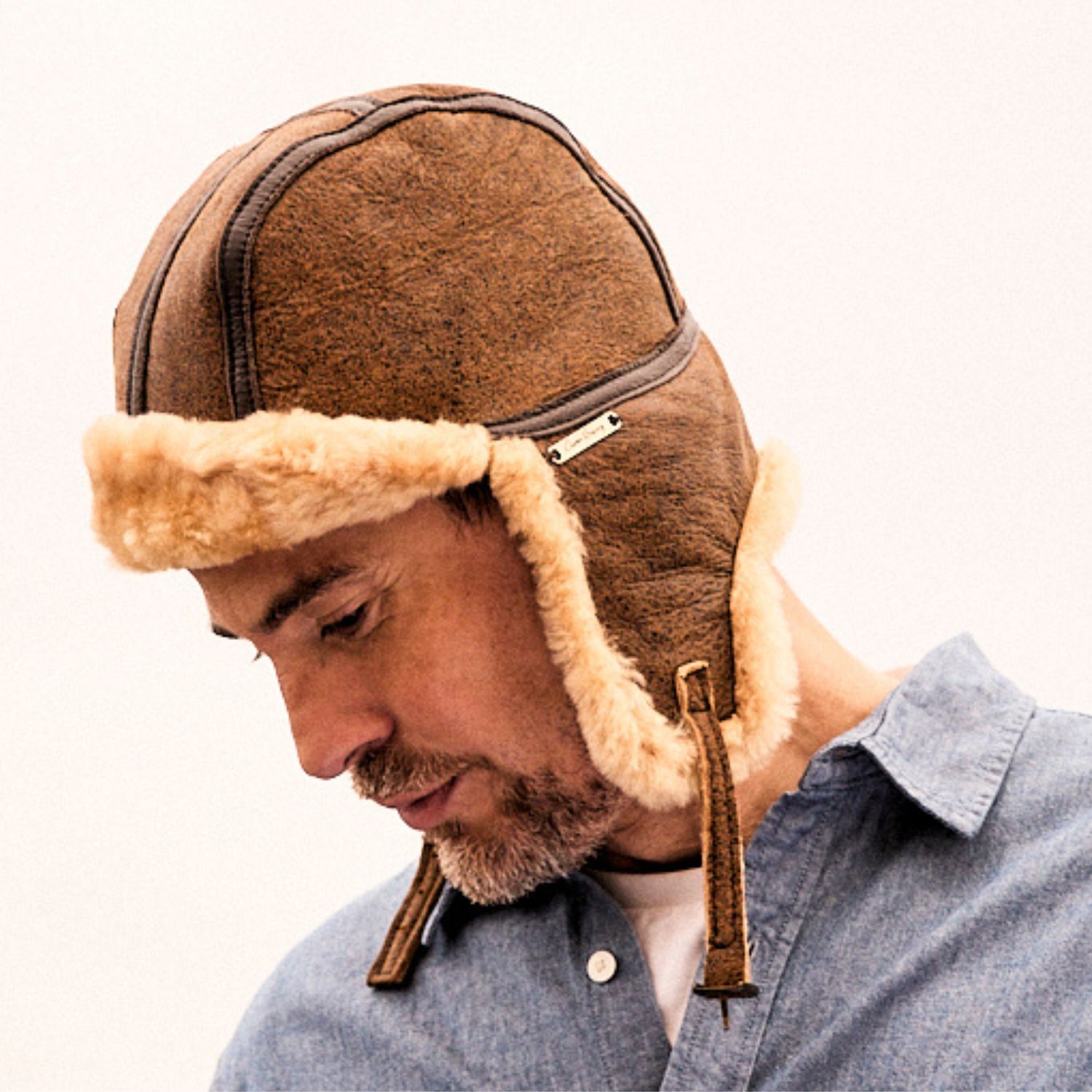 The soft sheepskin peak also takes its function from flying aircraft; it folds up or down to protect your eyes. Likewise, the generous earflaps can be closed tight under the chin with a buckle strap or fastened above the head.