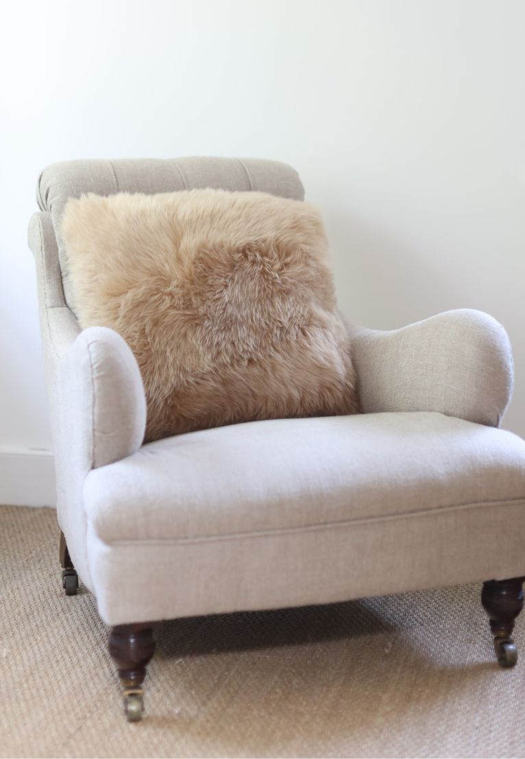 British sheepskin 50 x 50 cm cushions that are luxurious and super comfortable; these extra large cushions are hand cut and carefully made in Somerset from the finest British Sheepskins, backed with toning tactile pig suede; they are generously filled with British-made feather cushion pads.